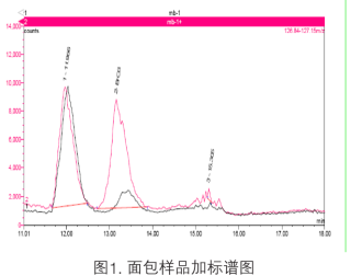 從市場和超市中選取兩種面包產(chǎn)品,上述離子色譜條件分析,所得回收率結果分別為98%和106%。樣品加標色譜圖如圖2所示。表1為面包樣品的測定結果。由這些數(shù)據(jù)可以看出,在所檢測的兩種面包中均含有不同含量的溴酸鹽。